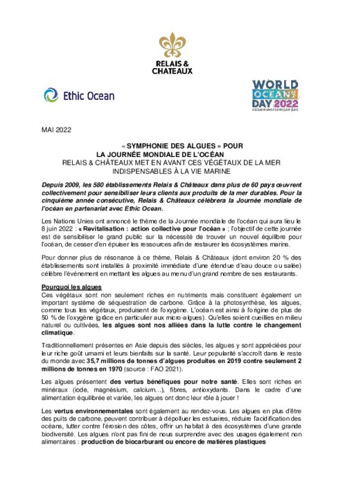 Les Nations Unies ont annoncé le thème de la Journée mondiale de l’océan qui aura lieu le 8 juin 2022 : « Revitalisation : action collective pour l’océan ». Cette année, Relais & Châteaux célèbre l’événement en mettant en avant les algues.