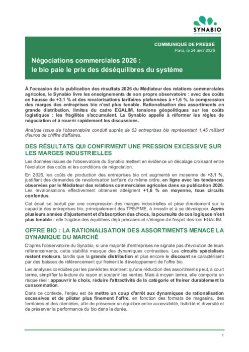 A l'occasion de la publication des résultats 2026 de l'Observatoire des négociations commerciales par le Médiateur des relations commerciales agricoles, le Synabio publie ce jour sa propre note d'analyse, issue de son observatoire conduit auprès de 63 entreprises bio représentant 1,45 milliard d'euros de chiffre d'affaires.