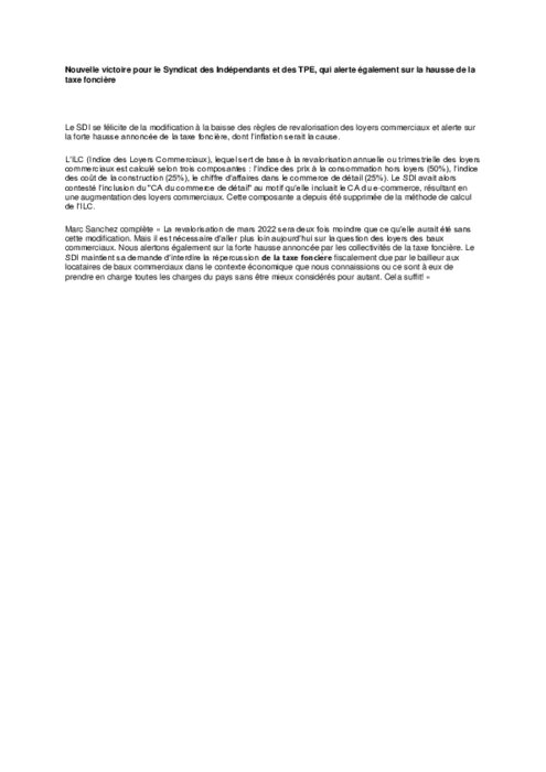 Métiers 29 mars 2022 - 17:01 Le SDI se félicite de la modification à la baisse des règles de revalorisation des loyers commerciaux et alerte sur la forte hausse annoncée de la taxe foncière, dont l’inflation serait la cause. PDF (98 Ko) Télécharger