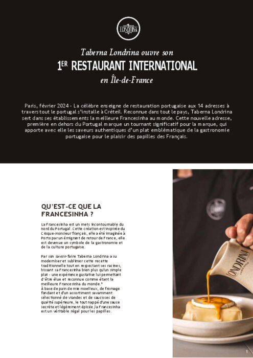 La célèbre enseigne de restauration portugaise aux 14 adresses à travers tout le Portugal s’installe à Créteil. Reconnue dans tout le pays, Taberna Londrina sert dans ses établissements la meilleure Francesinha au monde. Cette nouvelle adresse, première en dehors du Portugal marque un tournant significatif pour la marque, qui apporte avec elle les saveurs authentiques d’un plat emblématique de la gastronomie portugaise pour le plaisir des papilles des Français.
