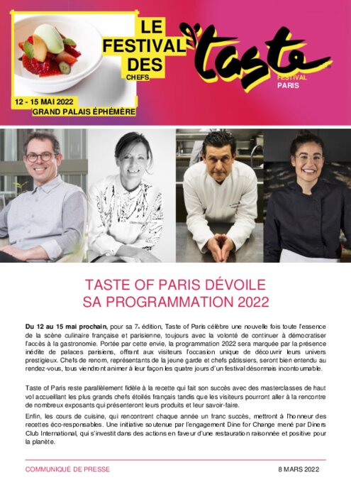 Métiers 08 mars 2022 - 17:37 Du 12 au 15 mai prochain, pour sa 7e édition, Taste of Paris célèbre une nouvelle fois toute l’essence de la scène culinaire française et parisienne, toujours avec la volonté de continuer à démocratiser l’accès à la gastronomie. PDF (1008 Ko) Télécharger