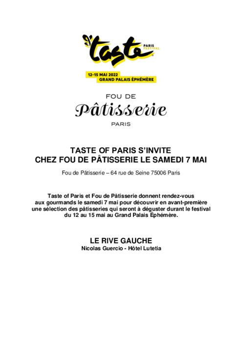 Métiers 29 avril 2022 - 09:48 Taste of Paris et Fou de Pâtisserie donnent rendez-vous aux gourmands le samedi 7 mai pour découvrir en avant-première une sélection des pâtisseries qui seront à déguster durant le festival du 12 au 15 mai au Grand Palais Éphémère. PDF (1 Mo) Télécharger