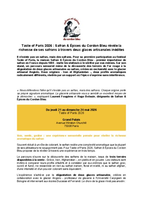Il n'existe pas un safran, mais des safrans. Pour sa première participation au festival Taste of Paris, la maison Safran & Épices du Cordon Bleu - premier importateur de safran en France depuis 1884 - invite les visiteurs à le vérifier par eux-mêmes. Sur son stand, un parcours sensoriel mène de la découverte des terroirs de l’or rouge à la dégustation de deux glaces artisanales au safran, créées en exclusivité avec le glacier artisanal Angiolo. Deux origines - Iran et Afghanistan -, deux profils aromatiques radicalement différents, révélés par un support où l'épice s'exprime sans interférence.