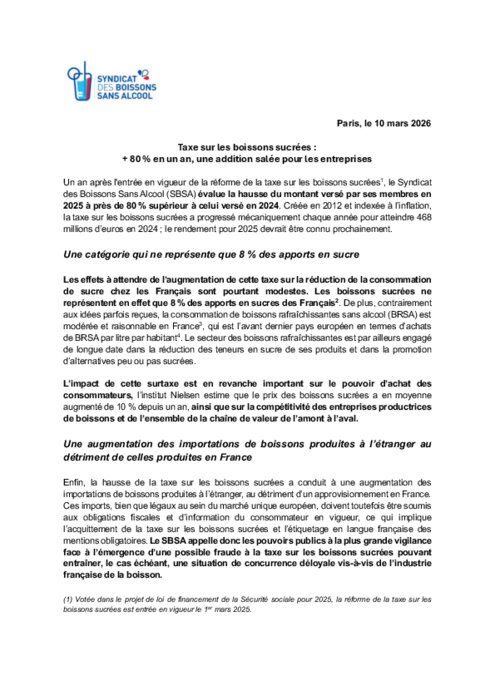 Un an après l'entrée en vigueur de la réforme de la taxe sur les boissons sucrées, le Syndicat des Boissons Sans Alcool (SBSA) évalue la hausse du montant versé par ses membres en 2025 à près de 80 % supérieur à celui versé en 2024. Créée en 2012 et indexée à l’inflation, la taxe sur les boissons sucrées a progressé mécaniquement chaque année pour atteindre 468 millions d’euros en 2024 ; le rendement pour 2025 devrait être connu prochainement.
