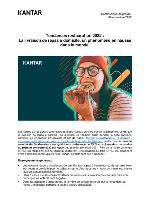 Tendances restauration 2022 : La livraison de repas à domicile, un phénomène en hausse dans le monde (Etude Kantar)