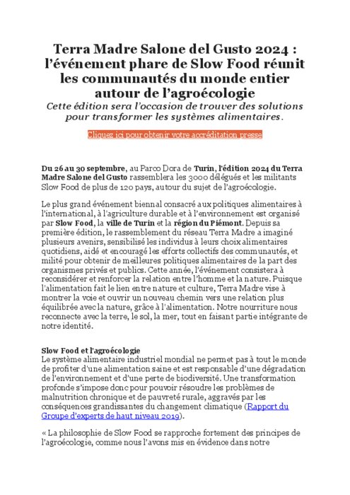 Du 26 au 30 septembre, au Parco Dora de Turin, l’édition 2024 du Terra Madre Salone del Gusto rassemblera les 3000 délégués et les militants Slow Food de plus de 120 pays, autour du sujet de l’agroécologie. Le plus grand événement biennal consacré aux politiques alimentaires à l’international, à l'agriculture durable et à l’environnement est organisé par Slow Food, la ville de Turin et la région du Piémont.