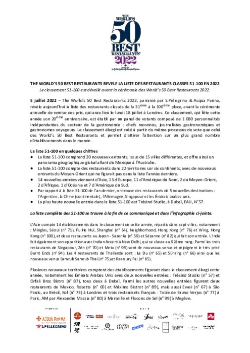 5 restaurants français rejoignent cette liste cette année (contre 4 en 2021) : Table de Bruno Verjus (77ème) AM par Alexandre Mazzia (80ème) et Flocons de Sel (99ème) y figurent pour la première fois, Alléno Paris au Pavillon Ledoyen se trouve en 58ème position et La Grenouillère progresse de 30 places pour se retrouver en 61ème position.