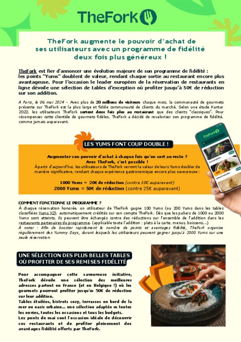 TheFork est fier d'annoncer une évolution majeure de son programme de fidélité : Les points "Yums" doublent de valeur, rendant chaque sortie au restaurant encore plus avantageuse. Pour l’occasion le leader européen de la réservation de restaurants en ligne dévoile une sélection de tables d’exception où profiter jusqu’à 50€ de réduction sur son addition.
