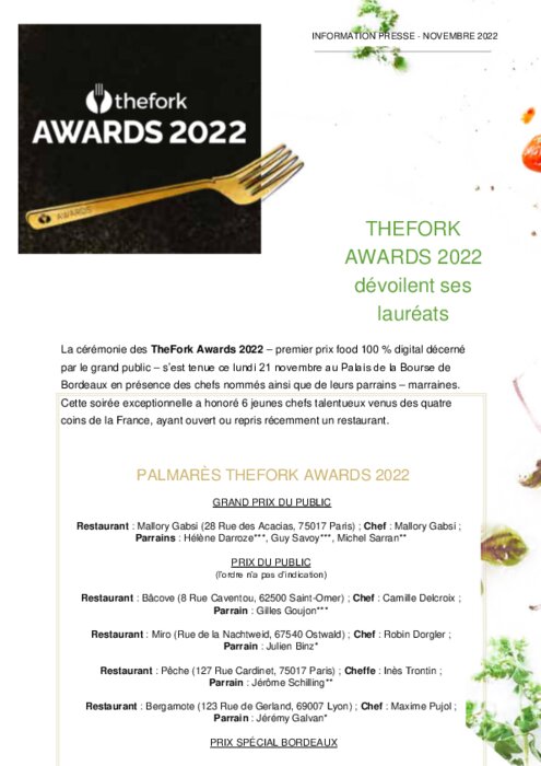 La cérémonie des TheFork Awards 2022 – premier prix food 100 % digital décerné par le grand public – s’est tenue ce lundi 21 novembre au Palais de la Bourse de Bordeaux en présence des chefs nommés ainsi que de leurs parrains – marraines.