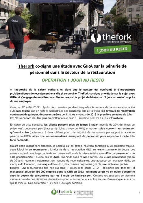 À l’approche de la saison estivale, et alors que le secteur est confronté à d'importantes problématiques de recrutement en salle et en cuisine, TheFork co-signe une étude sur le sujet avec GIRA et s’engage de manière concrète en lançant le projet de bénévolat “1 jour au resto” auprès de ses employés.