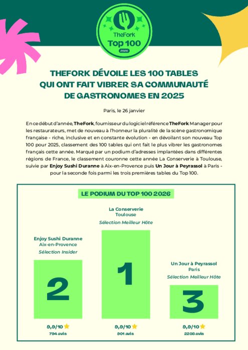 TheFork met une nouvelle fois à l’honneur la scène gastronomique française en dévoilant son Top 100 pour 2025 - le classement des tables qui ont fait le plus vibrer les gastronomes français cette année. Marqué par un podium d’adresses implantées dans différentes régions de France, le classement couronne cette année La Conserverie à Toulouse, Enjoy Sushi Duranne à Aix-en-Provence puis Un Jour à Peyrassol à Paris - pour la seconde fois parmi les trois premières tables du Top 100.