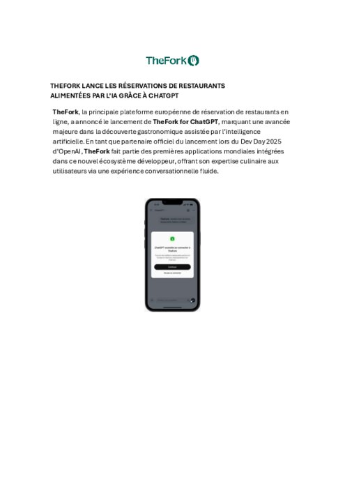 TheFork, la principale plateforme européenne de réservation de restaurants en ligne, a annoncé le lancement de TheFork for ChatGPT, marquant une avancée majeure dans la découverte gastronomique assistée par l’intelligence artificielle. En tant que partenaire officiel du lancement lors du Dev Day 2025 d’OpenAI, TheFork fait partie des premières applications mondiales intégrées dans ce nouvel écosystème développeur, offrant son expertise culinaire aux utilisateurs via une expérience conversationnelle fluide.