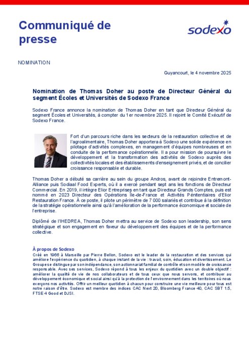 Fort d’un parcours riche dans les secteurs de la restauration collective et de l’agroalimentaire, Thomas Doher apportera à Sodexo une solide expérience en pilotage d’activités complexes, en management d’équipes nombreuses et en conduite de la performance opérationnelle. Il a pour mission de poursuivre le développement et la transformation des activités de Sodexo auprès des collectivités locales et des établissements d’enseignement privés, et de concilier croissance responsable et durable.
