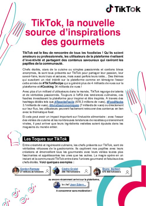 Métiers 26 octobre 2021 - 16:19 Chefs étoilés, stars de la cuisine ou simples passionnés et cordons bleus anonymes, ils sont tous présents sur TikTok pour partager leur passion, leur savoir-faire, leurs trucs et astuces, mais aussi parfois leurs ratés... PDF (2 Mo) Télécharger