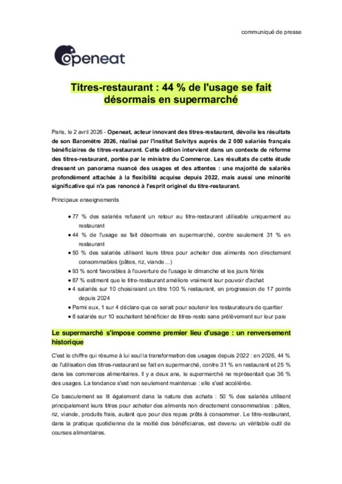 Openeat, acteur innovant des titres-restaurant, dévoile les résultats de son Baromètre 2026, réalisé par l'institut Selvitys auprès de 2 000 salariés français bénéficiaires de titres-restaurant. Cette édition intervient dans un contexte de réforme des titres-restaurant, portée par le ministre du Commerce. Les résultats de cette étude dressent un panorama nuancé des usages et des attentes : une majorité de salariés profondément attachée à la flexibilité acquise depuis 2022, mais aussi une minorité significative qui n'a pas renoncé à l'esprit originel du titre-restaurant.