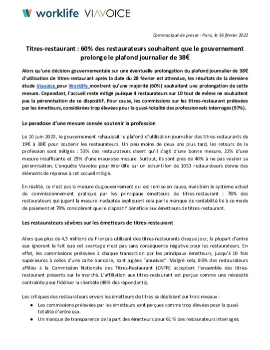 Alors qu’une décision gouvernementale sur une éventuelle prolongation du plafond journalier de 38€ d’utilisation de titres-restaurant après la date du 28 février est attendue, les résultats de la dernière étude Viavoice pour Worklife montrent qu’une majorité (60%) souhaitent une prolongation de cette mesure.