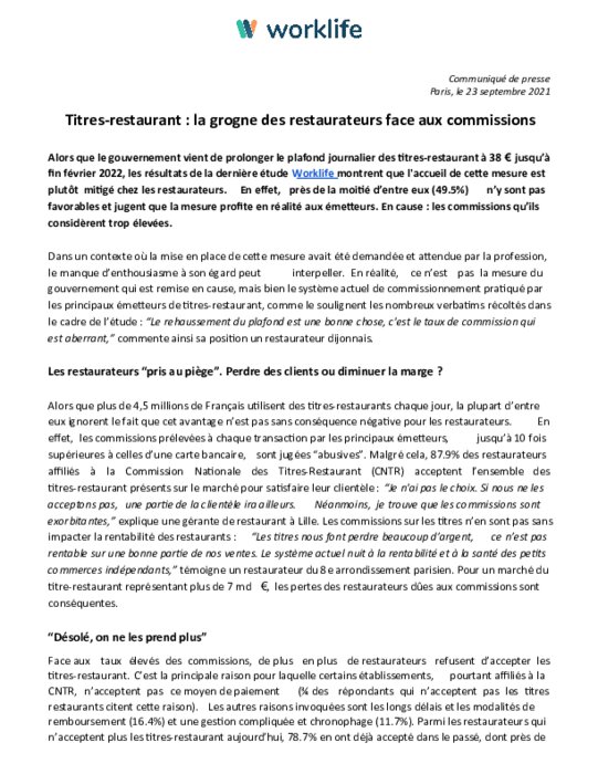 Métiers 23 septembre 2021 - 13:11 Alors que le gouvernement vient de prolonger le plafond journalier des titres-restaurant à 38€ jusqu’à fin février 2022, les résultats de la dernière étude Worklife montrent que l'accueil de cette mesure est plutôt mitigé chez les restaurateurs. PDF (111 Ko) Télécharger
