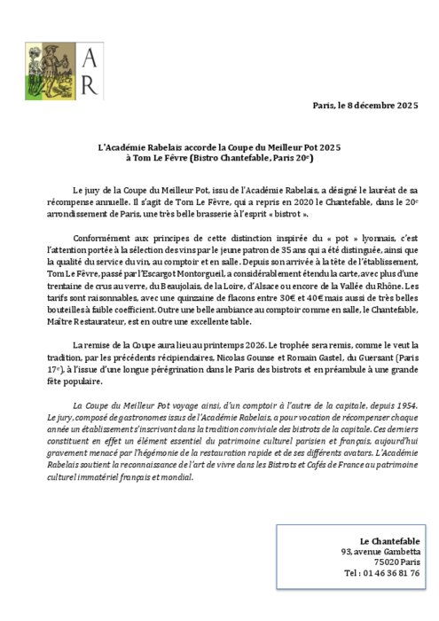 Le jury de la Coupe du Meilleur Pot, issu de l'Académie Rabelais, a désigné le lauréat de sa récompense annuelle. Il s’agit de Tom Le Fêvre, qui a repris en 2020 le Chantefable, dans le 20e arrondissement de Paris, une très belle brasserie à l’esprit « bistrot ».