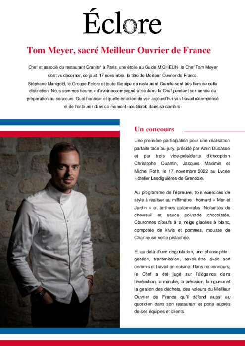Métiers 17 novembre 2022 - 22:02 Chef et associé du restaurant Granite à Paris, une étoile au Guide MICHELIN, le Chef Tom Meyer s’est vu décerner, le jeudi 17 novembre, le titre de Meilleur Ouvrier de France. PDF (207 Ko) Télécharger