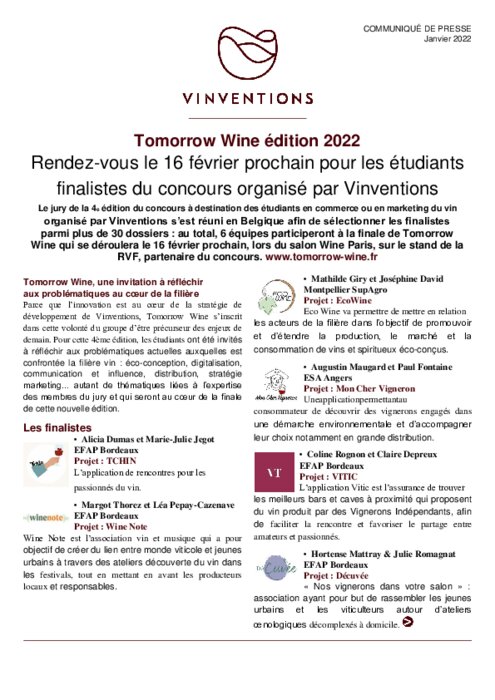 Le jury de la 4e édition du concours à destination des étudiants en commerce ou en marketing du vin organisé par Vinventions s’est réuni en Belgique afin de sélectionner les finalistes parmi plus de 30 dossiers : au total, 6 équipes participeront à la finale de Tomorrow Wine qui se déroulera le 16 février prochain, lors du salon Wine Paris, sur le stand de la RVF, partenaire du concours.