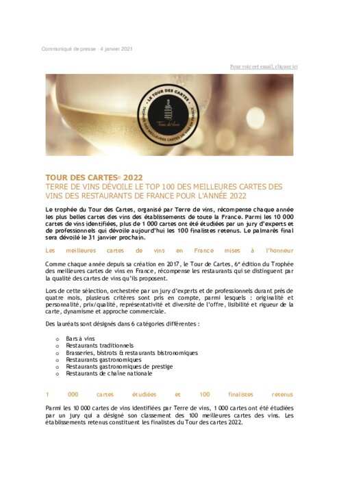 Métiers 04 janvier 2022 - 11:20 Le trophée du Tour des Cartes, organisé par Terre de vins, récompense chaque année les plus belles cartes des vins des établissements de toute la France. PDF (356 Ko) Télécharger