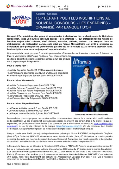 Métiers 26 avril 2022 - 15:42 Banquet d’Or, spécialiste des pains et viennoiseries à destination des professionnels de l’hôtellerie restauration, lance un nouveau concours baptisé « Les Enfarinés ». PDF (172 Ko) Télécharger