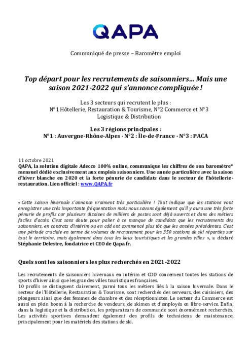 Métiers 11 octobre 2021 - 06:30 Après la saison blanche de l'hiver 2020-2021, les professionnels de la montagne et des grandes villes touristiques se préparent à une hausse exceptionnelle de l'affluence. PDF (199 Ko) Télécharger