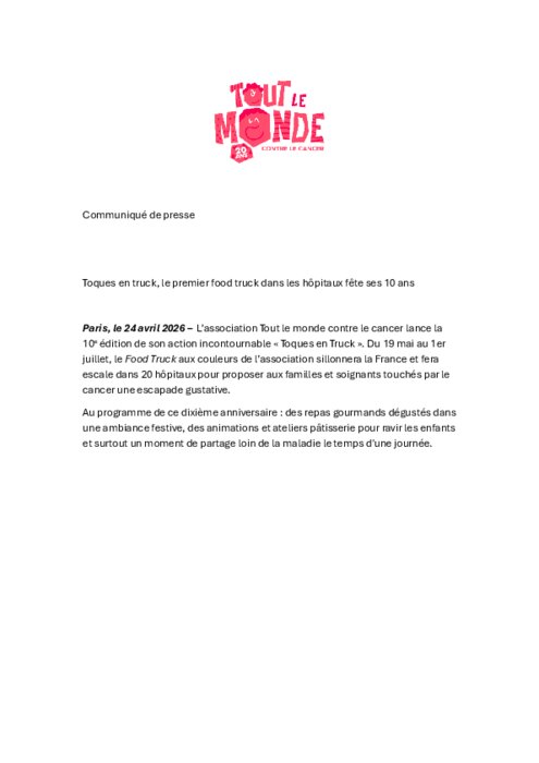 L’association Tout le monde contre le cancer lance la 10e édition de son action incontournable « Toques en Truck ». Du 19 mai au 1er juillet, le Food Truck aux couleurs de l’association sillonnera la France et fera escale dans 20 hôpitaux pour proposer aux familles et soignants touchés par le cancer une escapade gustative.