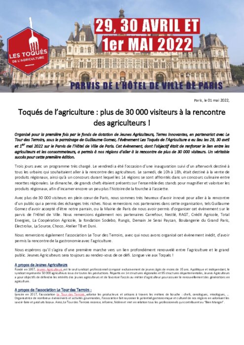 Organisé pour la première fois par le fonds de dotation de Jeunes Agriculteurs, Terres Innovantes, en partenariat avec Le Tour des Terroirs, sous le parrainage de Guillaume Gomez, l'évènement Les Toqués de l'Agriculture a eu lieu les 29, 30 avril et 1er mai 2022 sur le Parvis de l'Hôtel de Ville de Paris.