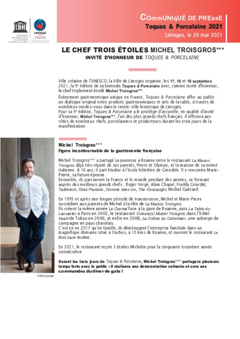 Métiers 20 mai 2021 - 15:20 Ville créative de l’UNESCO, la Ville de Limoges organise, les 17, 18 et 19 septembre 2021, la 9e édition de sa biennale Toques & Porcelaine avec, comme invité d’honneur, le chef triplement étoilé Michel Troisgros***. PDF (952 Ko) Télécharger