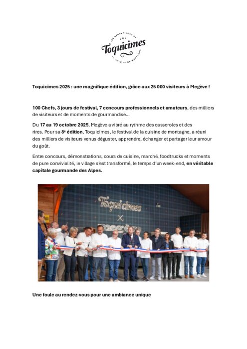 100 chefs, 3 jours de festival, 7 concours professionnels et amateurs, des milliers de visiteurs et de moments de gourmandise…Du 17 au 19 octobre, Megève a vibré au rythme des casseroles et des rires. Pour sa 8ᵉ édition, Toquicimes, le festival de la cuisine de montagne, a réuni des milliers de visiteurs venus déguster, apprendre, échanger et partager leur amour du goût.