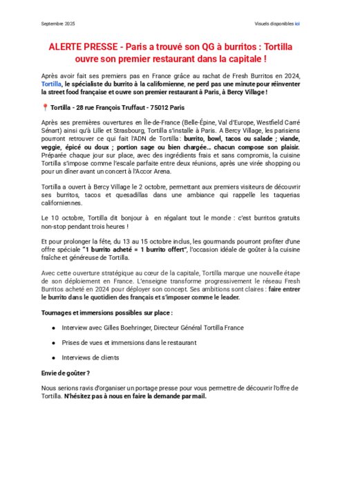 Après avoir fait ses premiers pas en France grâce au rachat de Fresh Burritos en 2024, Tortilla, le spécialiste du burrito à la californienne, ne perd pas une minute pour réinventer la street food française et ouvre son premier restaurant à Paris, à Bercy Village