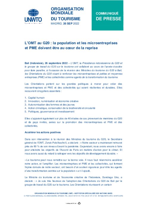 Métiers 28 septembre 2022 - 13:48 Le tourisme international continue de montrer de nets signes de reprise avec des arrivées qui ont atteint 57 % des niveaux d’avant la pandémie au cours des sept premiers mois 2022. PDF (161 Ko) Télécharger