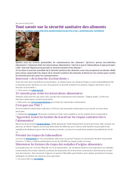 Quelles sont les sources potentielles de contamination des aliments ? Qu’est-ce qu’une toxi-infection alimentaire ? Comment éviter les intoxications alimentaires ? Qu’est-ce que la Salmonellose et que provoque-t-elle ? Que fait l’Agence pour garantir la sécurité sanitaire d’un aliment ?