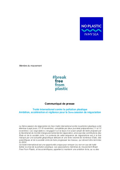 La 3ème session de négociation du futur traité international contre la pollution plastique a été étendue à sept jours (13-19 novembre), complétés par deux journées préparatoires (11 et 12 novembre).