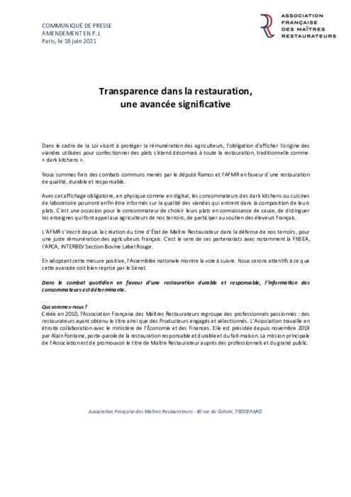 L’Association Française des Maitres Restaurateurs tient à saluer l’avancée significative en faveur d’une restauration durable effectuée par le député Richard Ramos, qui a proposé avec succès un amendement pour plus de transparence dans la restauration.