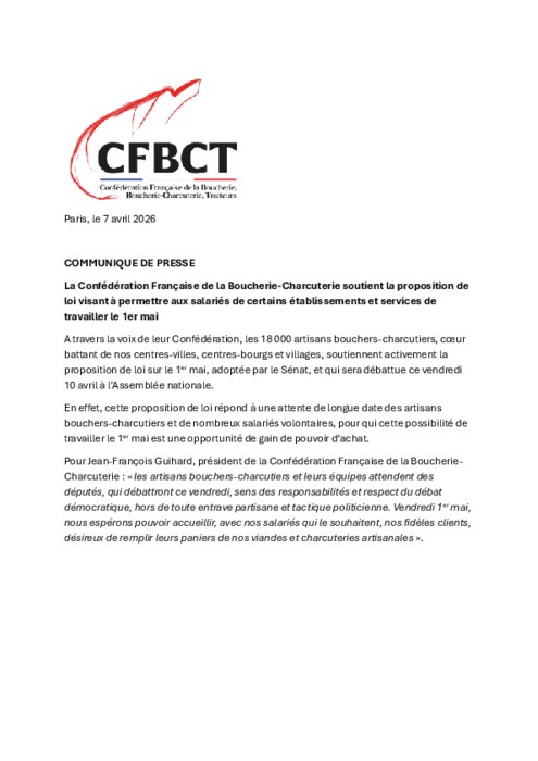 A travers la voix de leur Confédération, les 18 000 artisans bouchers-charcutiers, cœur battant de nos centres-villes, centres-bourgs et villages, soutiennent activement la proposition de loi sur le 1er mai, adoptée par le Sénat, et qui sera débattue ce vendredi 10 avril à l’Assemblée nationale.