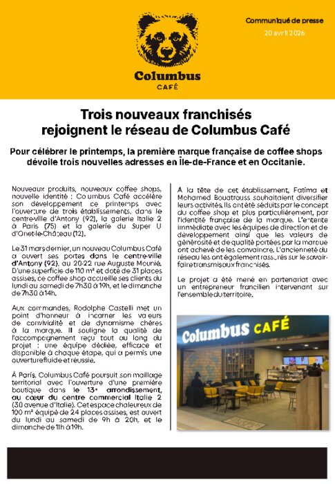 Snacking 20 avril 2026 - 09:52 Columbus Café dévoile trois nouvelles adresses dans le centre-ville d’Antony (92), la galerie Italie 2 à Paris (75) et la galerie du Super U d’Onet-le-Château (12). PDF (871 Ko) Télécharger credit Columbus Café