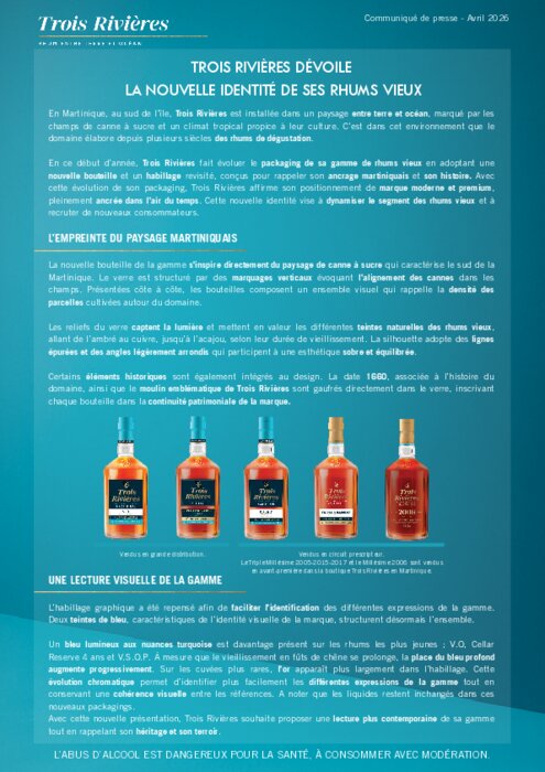 En ce début d’année, Trois Rivières fait évoluer le packaging de sa gamme de rhums vieux en adoptant une nouvelle bouteille et un habillage revisité, conçus pour rappeler son ancrage martiniquais et son histoire. Avec cette évolution de son packaging, Trois Rivières affirme son positionnement de marque moderne et premium, pleinement ancrée dans l’air du temps. Cette nouvelle identité vise à dynamiser le segment des rhums vieux et à recruter de nouveaux consommateurs.