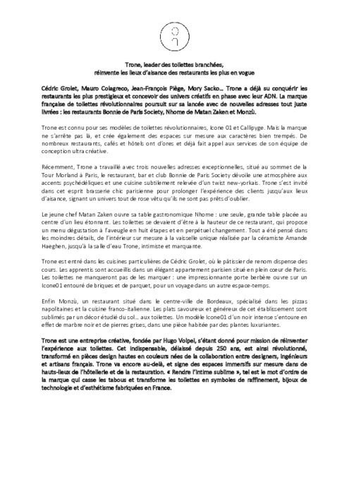 Fournisseurs 24 novembre 2022 - 09:25 Cédric Grolet, Mauro Colagreco, Jean-François Piège, Mory Sacko… Trone a déjà su conquérir les restaurants les plus prestigieux et concevoir des univers créatifs en phase avec leur ADN. PDF (60 Ko) Télécharger