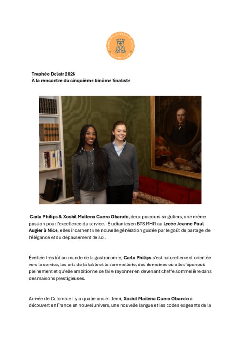 Carla Philips & Xoshil Maïlena Cuero Obando, deux parcours singuliers, une même passion pour l’excellence du service. Étudiantes en BTS MHR au Lycée Jeanne Paul Augier à Nice, elles incarnent une nouvelle génération guidée par le goût du partage, de l’élégance et du dépassement de soi.