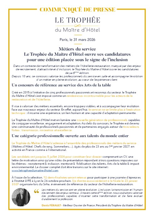 Dans un contexte de transformation des métiers de l’hôtellerie-restauration, marqué par des enjeux de recrutement, d’attractivité et d’inclusion, le Trophée du Maître d’Hôtel ouvre les candidatures de sa 6e édition. Depuis 10 ans, ce concours valorise les professionnels du service en salle et accompagne l’évolution d’un métier en pleine évolution, au cœur de l’expérience client.