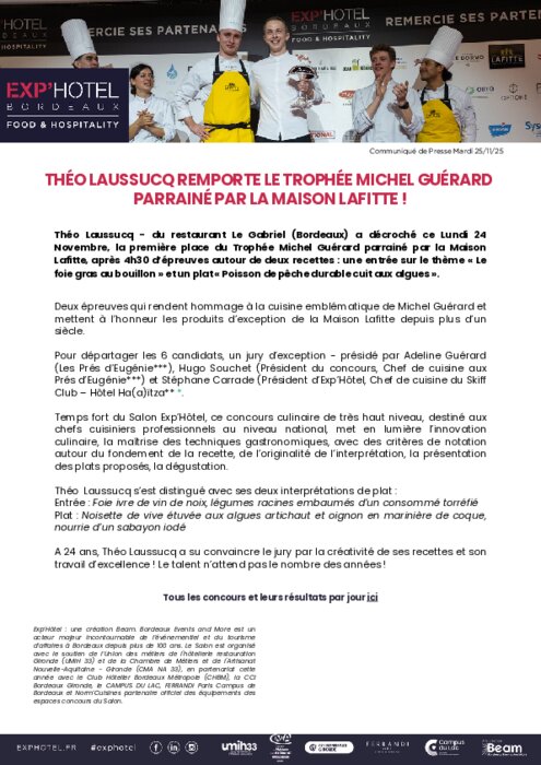 Théo Laussucq - du restaurant Le Gabriel (Bordeaux) a décroché ce Lundi 24 novembre, la première place du Trophée Michel Guérard parrainé par la Maison Lafitte, après 4h30 d’épreuves autour de deux recettes : une entrée sur le thème « Le foie gras au bouillon » et un plat « Poisson de pêche durable cuit aux algues ».