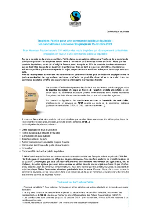 Après le succès de la première édition, Fairtile lance sa deuxième édition des Trophées de la commande publique équitable : les trophées seront remis à l'occasion du Salon des Maires en 2024 ! Alors que les produits équitables, y compris d’origine France, sont intégrés au 50% de produits durables demandés aux collectivités depuis la loi Egalim 2, Max Havelaar France tient à remercier et mettre en lumière les acheteurs publics qui se sont emparés du sujet, respectent cette ambition, voire pour beaucoup, vont au-delà.