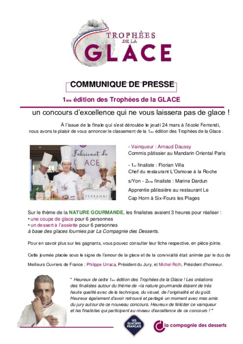 À l’issue de la finale qui s’est déroulée le jeudi 24 mars à l’école Ferrandi, voici le classement de la 1ère édition des Trophées de la Glace
