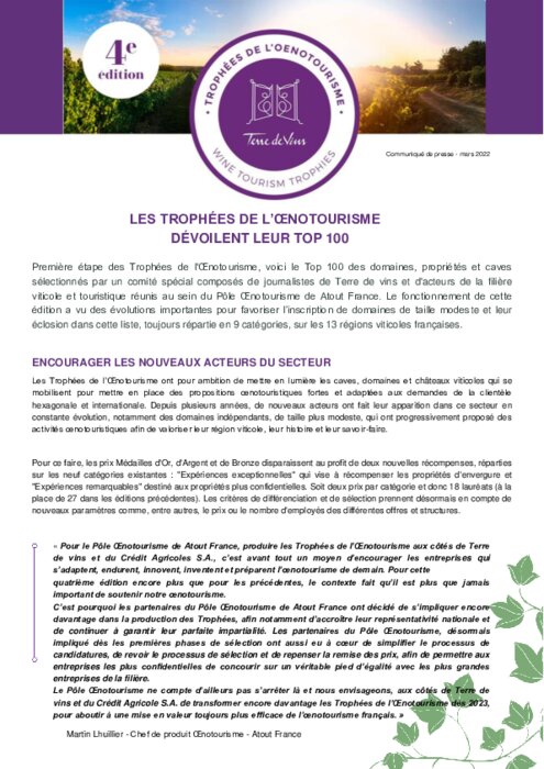 Première étape des Trophées de l'Œnotourisme, voici le Top 100 des domaines, propriétés et caves sélectionnés par un comité spécial composés de journalistes de Terre de vins et d'acteurs de la filière viticole et touristique réunis au sein du Pôle Œnotourisme de Atout France.