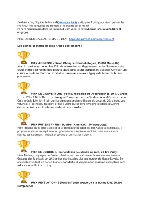 Métiers 11 septembre 2022 - 18:27 Ce dimanche, l’équipe du festival Omnivore Paris a décerné 7 prix pour récompenser les chefs qui font l’actualité du moment et la cuisine de demain . PDF (127 Ko) Télécharger