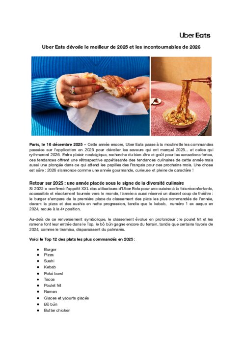 Cette année encore, Uber Eats passe à la moulinette les commandes passées sur l'application en 2025 pour dévoiler les saveurs qui ont marqué 2025... et celles qui rythmeront 2026. Entre plaisir nostalgique, recherche du bien-être et goût pour les sensations fortes, ces tendances offrent une rétrospective appétissante des tendances culinaires de cette année mais aussi une plongée dans ce qui attend les papilles des Français pour ces prochains mois. Une chose est sûre : 2026 s’annonce comme une année gourmande, curieuse et pleine de caractère