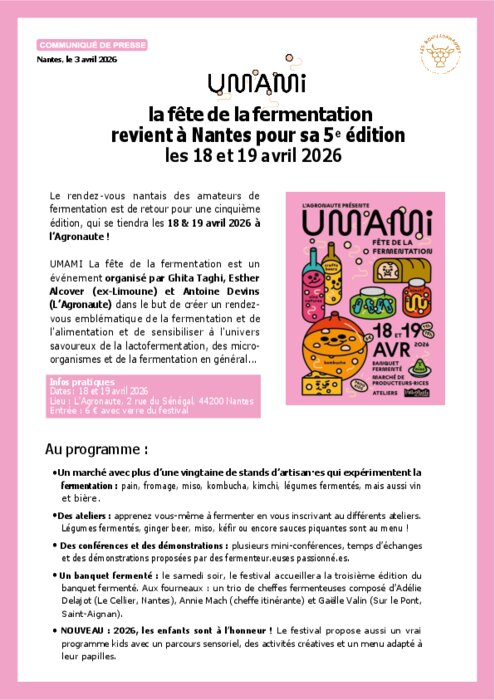 Fournisseurs 03 avril 2026 - 14:33 Les 18 et 19 avril, Nantes accueille la 5è édition de Umami, Fête de la Fermentation : 2 jours d'évènements entièrements dédiés à la fermentation sous toutes ses formes (kéfir, kimchi, miso, koji, bières, sauces piquantes...) PDF (496 Ko) Télécharger