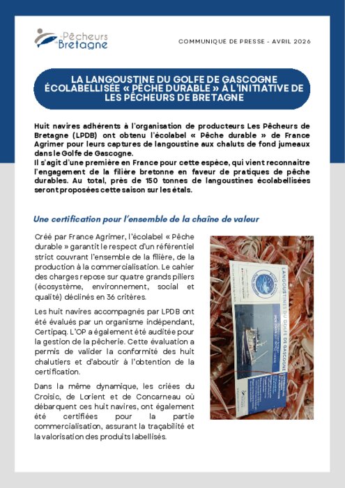 A l'occasion de l'ouverture de la saison de la langoustine, l'Organisation de Producteurs Les Pêcheurs de Bretagne annonce l'obtention de l'Écolabel Pêche Durable de France AgriMer pour 8 de ses navires adhérents et leurs trois Halles à Marées de débarque. Cette certification vient souligner les efforts de la filière pêche pour mieux valoriser des produits d'exception auprès des consommateurs et inscrire leur activité dans des démarches toujours plus durables.
